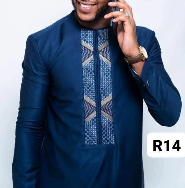 Tunique élégante homme bleu avec motifs géométriques. Conçue pour les hommes élégants, cette chemise est parfaite pour les occasions spéciales ou pour ajouter une touche d'authenticité africaine à votre tenue quotidienne.