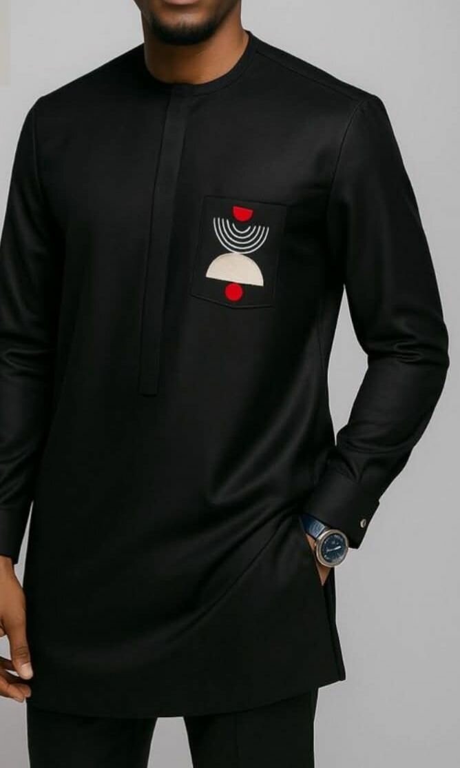 Tunique noire pour homme, parfaite pour les occasions spéciales. Conçue avec un motif géométrique sur la poche, elle combine style et tradition.