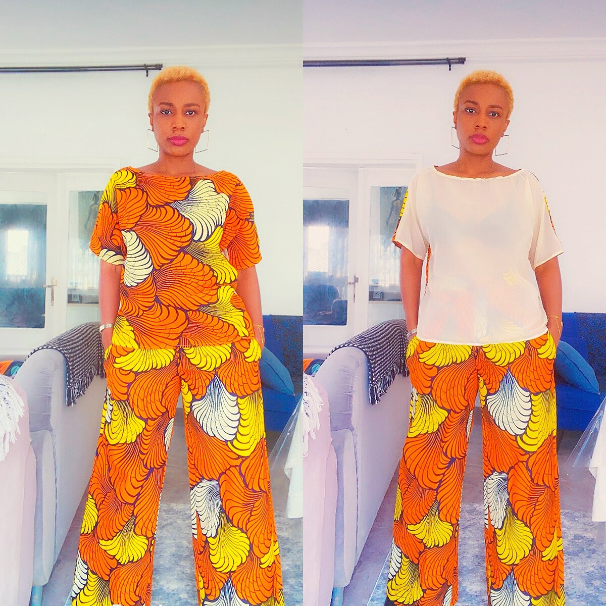 Tunique Bi-matiere ( wax & mousseline) Pantalon gros bas Élastique à la taille et fermeture éclaire Taille : S/M & L/XL 2 look en 1 ( peut se porter de 2 façon voir image )