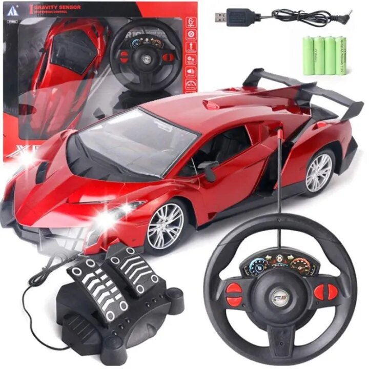une voiture de sport télécommandée avec un volant de simulation et des pédales, qui utilise un capteur de gravité pour le contrôle. Voici