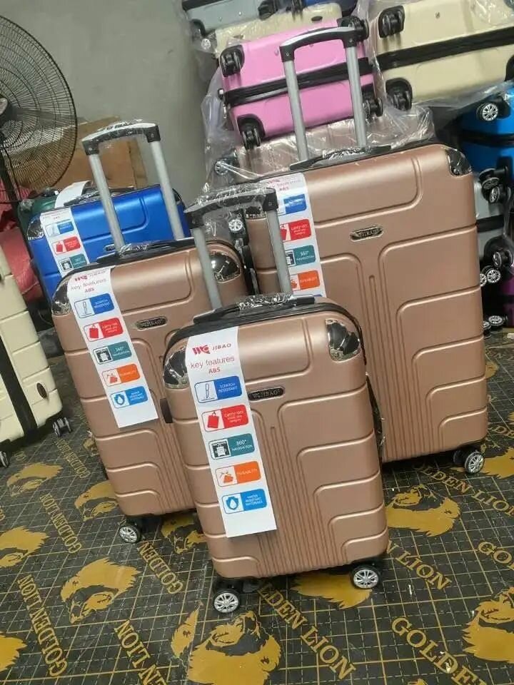 Ensemble de valises rigides en ABS de couleur bronze. Robustes et légères, elles sont idéales pour les voyages. Équipées de roulettes et d'une poignée télescopique pour un déplacement facile.