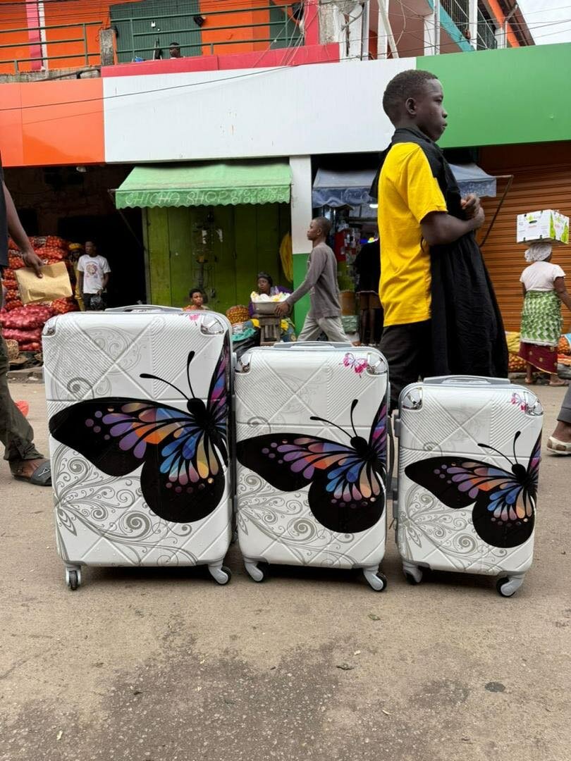 Ensemble de valises élégantes avec motif papillon coloré. Parfait pour les voyages, ces valises offrent à la fois style et fonctionnalité. Faciles à manœuvrer grâce à leurs roulettes pivotantes.