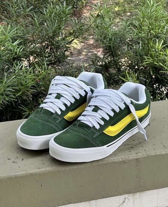 Découvrez ces baskets stylées en daim vert avec une bande jaune. Elles sont parfaites pour un look urbain et décontracté. Confortables et robustes, elles sont idéales pour le skate ou les promenades en ville. Un choix tendance pour les amateurs de mode.