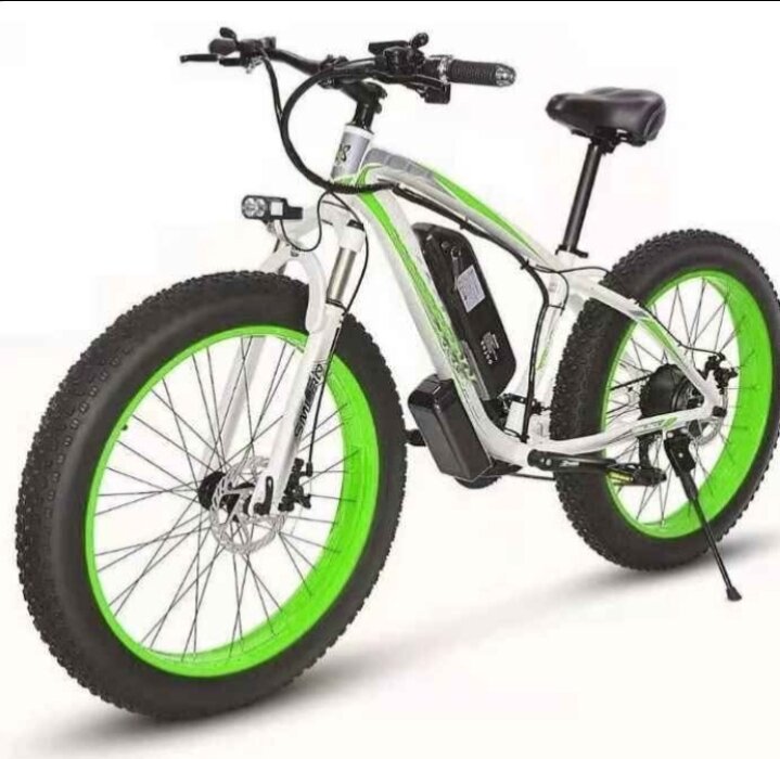 Découvrez notre vélo électrique tout terrain robuste avec un cadre blanc et des accents verts. Équipé de pneus tout-terrain, il est idéal pour les randonnées et les trajets quotidiens en ville. Sa batterie intégrée offre une autonomie exceptionnelle.