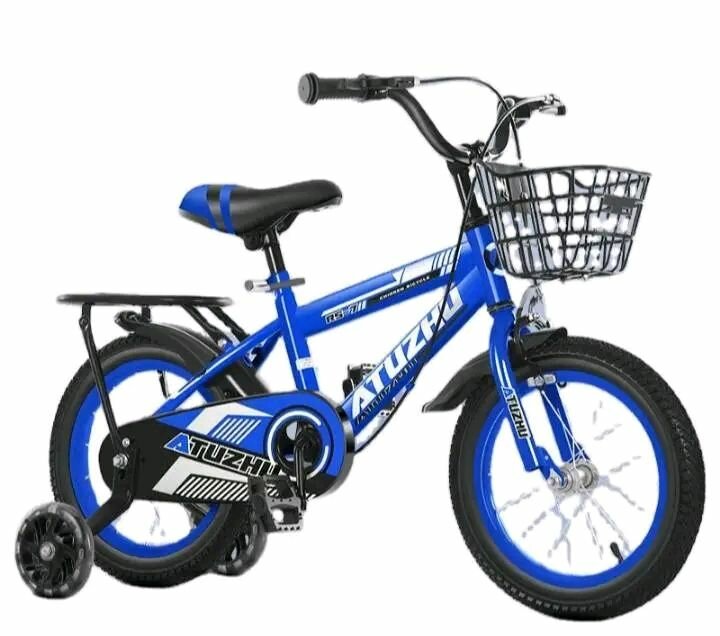 Vélo enfant bleu avec panier et roues d'entraînement, idéal pour les premiers parcours. Confort assuré avec siège réglable et guidon antidérapant.