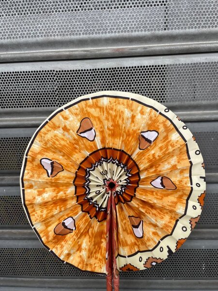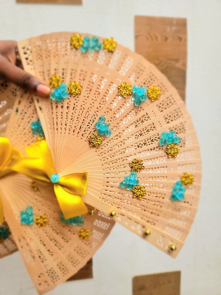 Cet éventail en bois délicatement décoré est idéal pour ajouter une touche d'élégance à vos tenues de cérémonie. Parfait pour les mariages ou les occasions spéciales, il se distingue par ses ornements jaunes et bleus raffinés. L'accessoire idéal pour un style unique et sophistiqué.