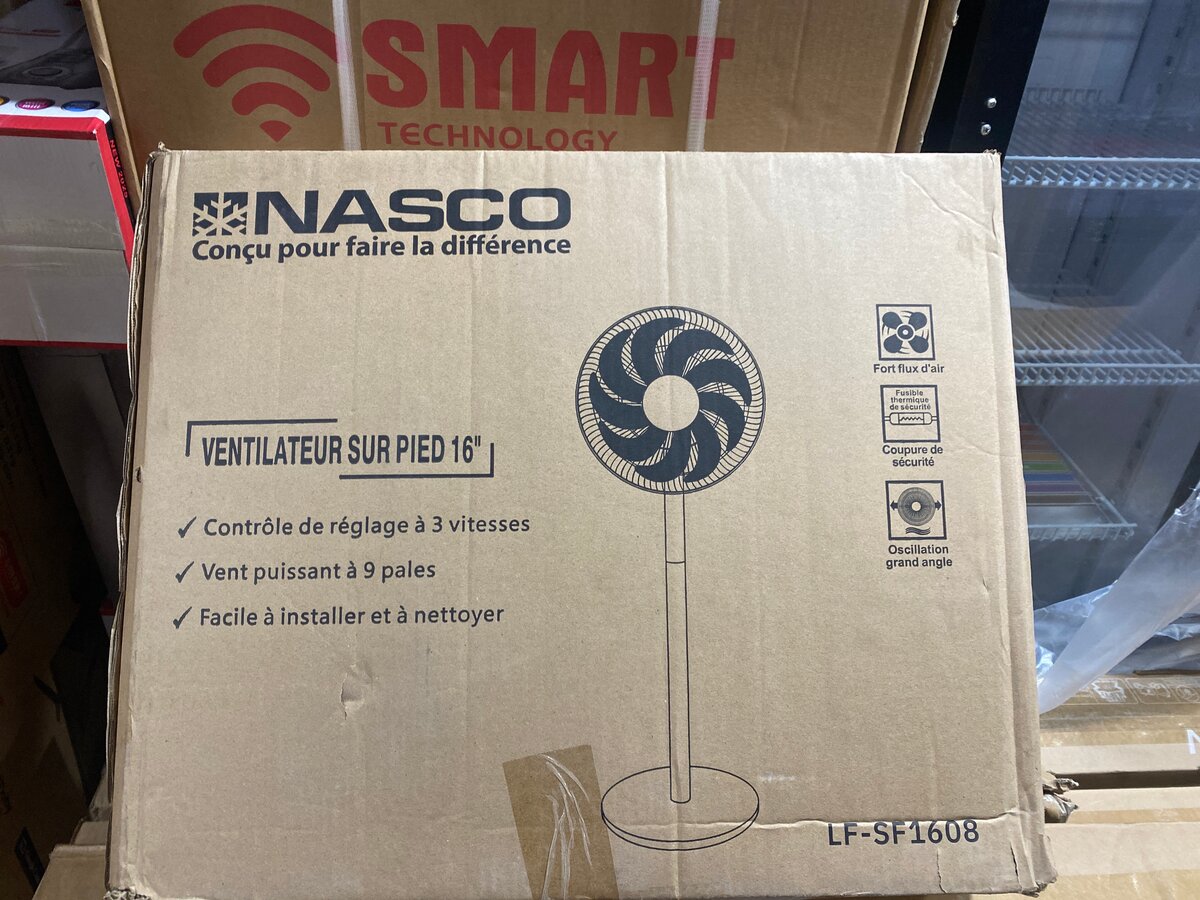Puissant ventilateur sur pied Nasco 16" avec réglage à 3 vitesses et 9 pales, idéal pour rafraîchir n'importe quelle pièce rapidement. Facile à installer et nettoyer.