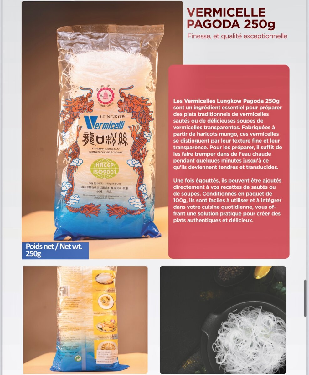 Découvrez les Vermicelles Lungkow 250g, parfaits pour des soupes et plats asiatiques authentiques. Fabriqués à partir d'amidon de haricot mungo, ces vermicelles transparents se transforment en une délicieuse texture après cuisson. Idéal pour vos recettes créatives et diététiques, ce produit certifié HACCP est le choix parfait pour une cuisine saine et savoureuse.