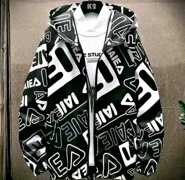 Veste à capuche pour homme, noire avec motifs blancs. Idéale pour un look décontracté et tendance. Confectionnée pour un confort optimal.