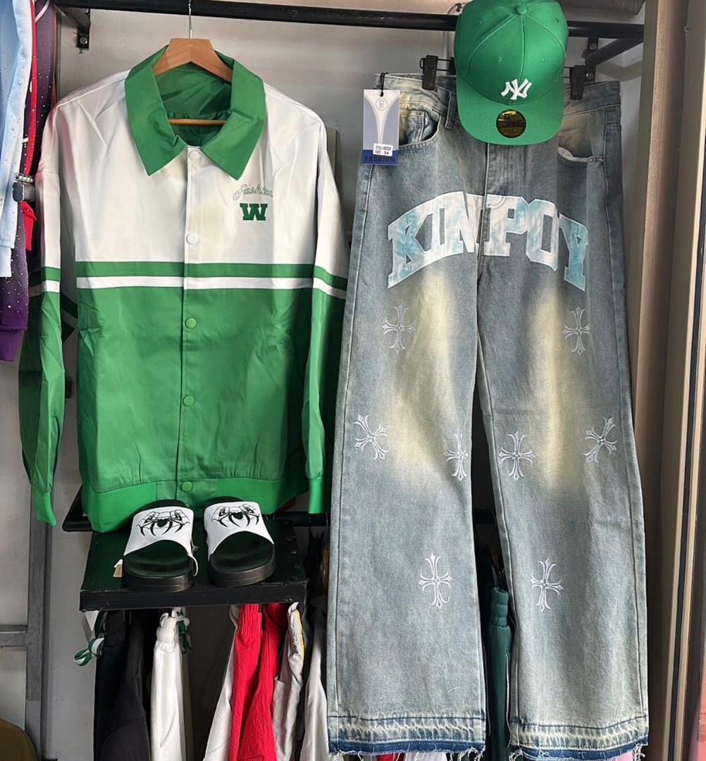 Veste coupe-vent verte et blanche pour homme, parfaite pour un look streetwear. Conçue pour être confortable et élégante.