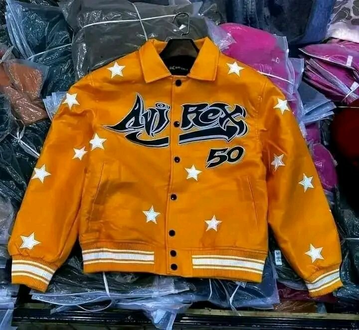 Veste de baseball orange pour femme avec étoiles blanches et impression 'Air.Fox 50'. Conçue pour un style streetwear décontracté.