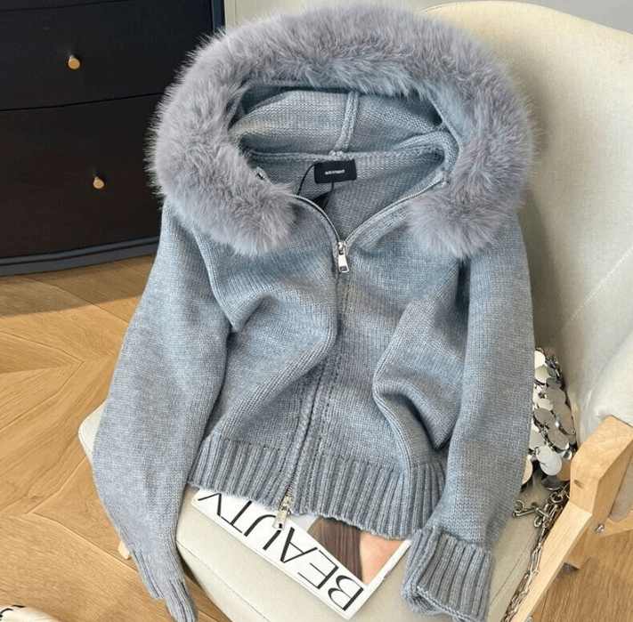 Découvrez cette élégante veste en laine grise avec capuche à fausse fourrure. Parfaite pour les journées fraîches, elle allie chaleur et style. Sa fermeture éclair pratique et sa texture douce en font un choix idéal pour toute garde-robe.