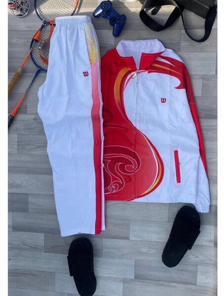 Ensemble de sport Supreme rouge et blanc pour homme. Comprend une veste et un pantalon. Conception élégante et confortable.