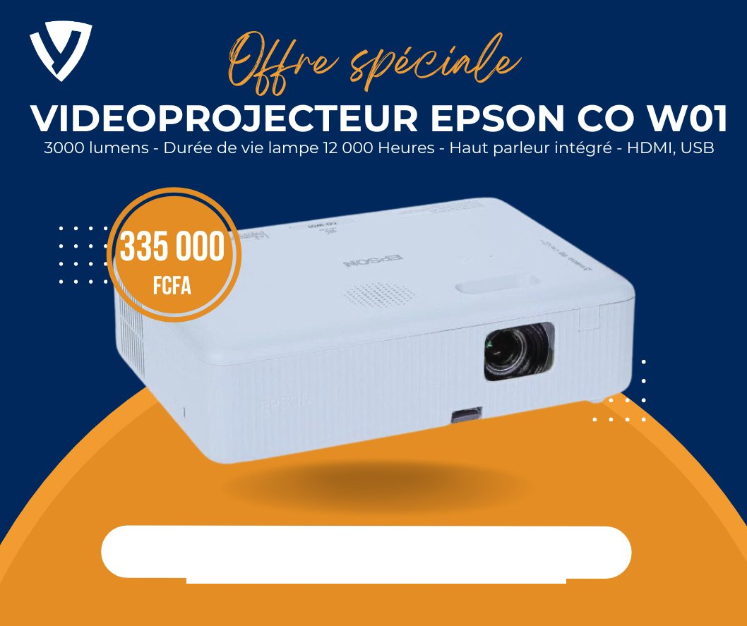 Vidéoprojecteur Epson CO-W01 à technologie 3LCD, Résolution : WXGA (1280 x 800 pixels), Luminosité : 3000 Lumens, Projection d’une image jusqu’à 378 pouces, Lampe avec durée de vie jusqu’à 12 000 heures (mode Eco), Zoom numérique 1.35x, correction keystone H/V (manuel +/-30°), Quick Corner, 1x HDMI 1.4 + 1x USB-A 2.0 + 1x USB-B 2.0 (service), Projection sans fil en ajoutant le module ELPAP11 optionnel, Haut-parleur 5 Watts intégré