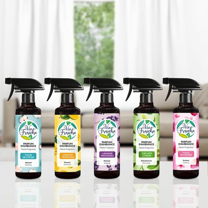 Découvrez Vie Fraiche, votre spray d'ambiance pour une maison fraîche et parfumée. Choix variés de senteurs apaisantes. Idéal pour créer une atmosphère relaxante chez vous.