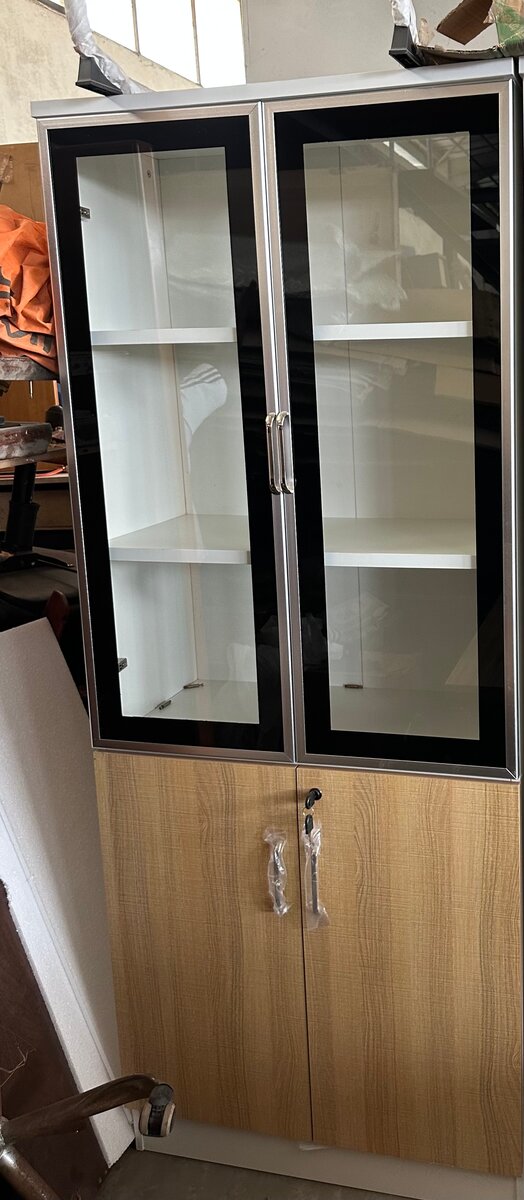 Vitrine en bois avec portes vitrées, idéale pour exposer vos objets précieux. Parfait pour le salon ou le bureau, elle offre style et fonctionnalité.