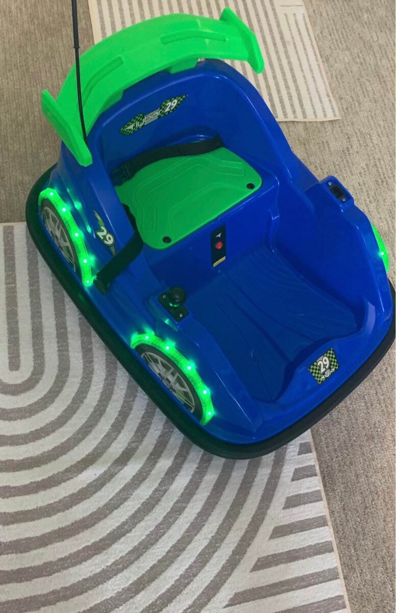Voiture électrique pour enfants, design bleu et vert, avec éclairage LED. Convient aux enfants, utilisation intérieure. Marque : Non spécifiée. Fonctionnalités : Siège confortable, sécurité optimale. Idéal pour les cadeaux d'anniversaire ou de Noël.