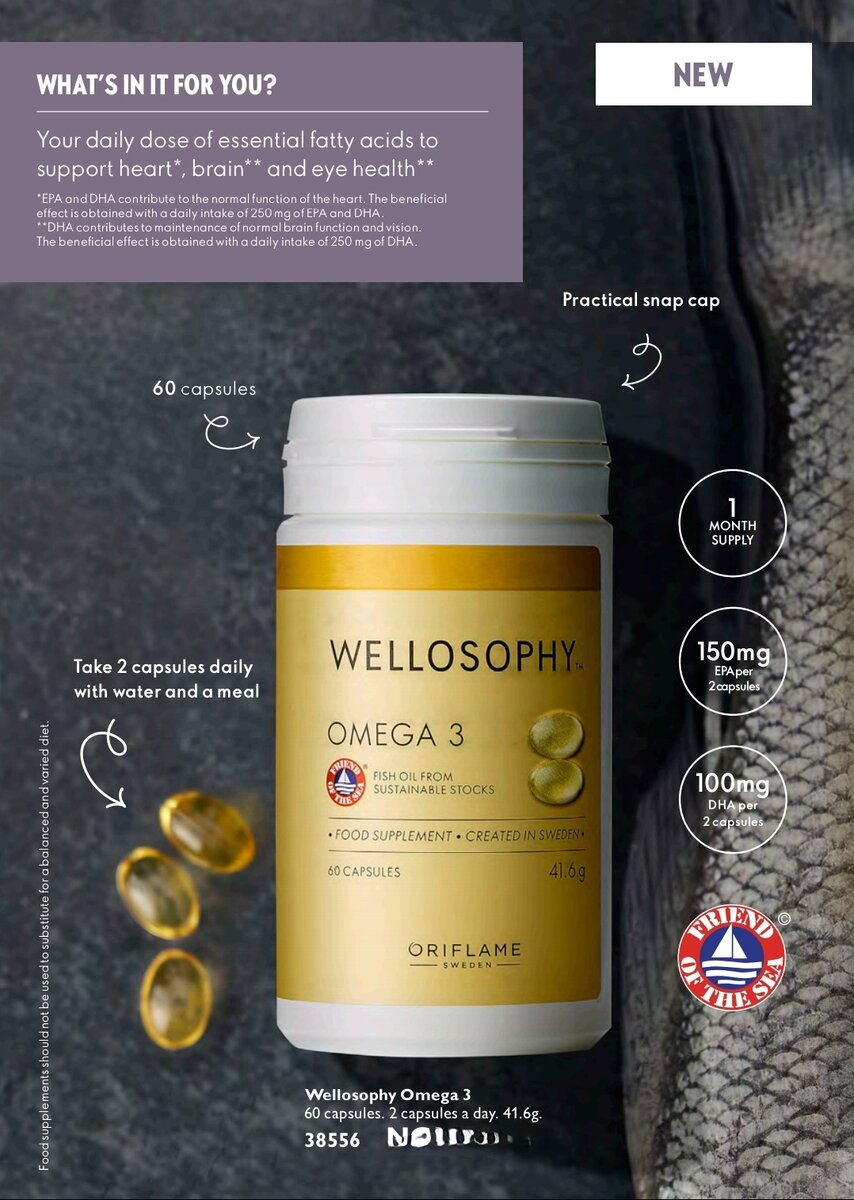 60 capsules. Wellosophy Omega 3 capsules provide the fish oil-derived fatty acids EPA and DHA that contribute to normal function of the heart, brain and eyes.