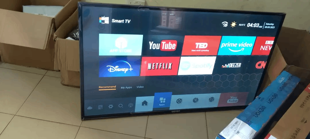 Weyon 55 inches smart android TV. It has hdmi, usb, av, digital and satellite ports. It youtube, google play store, chrome cast built-in, Netflix, and more.