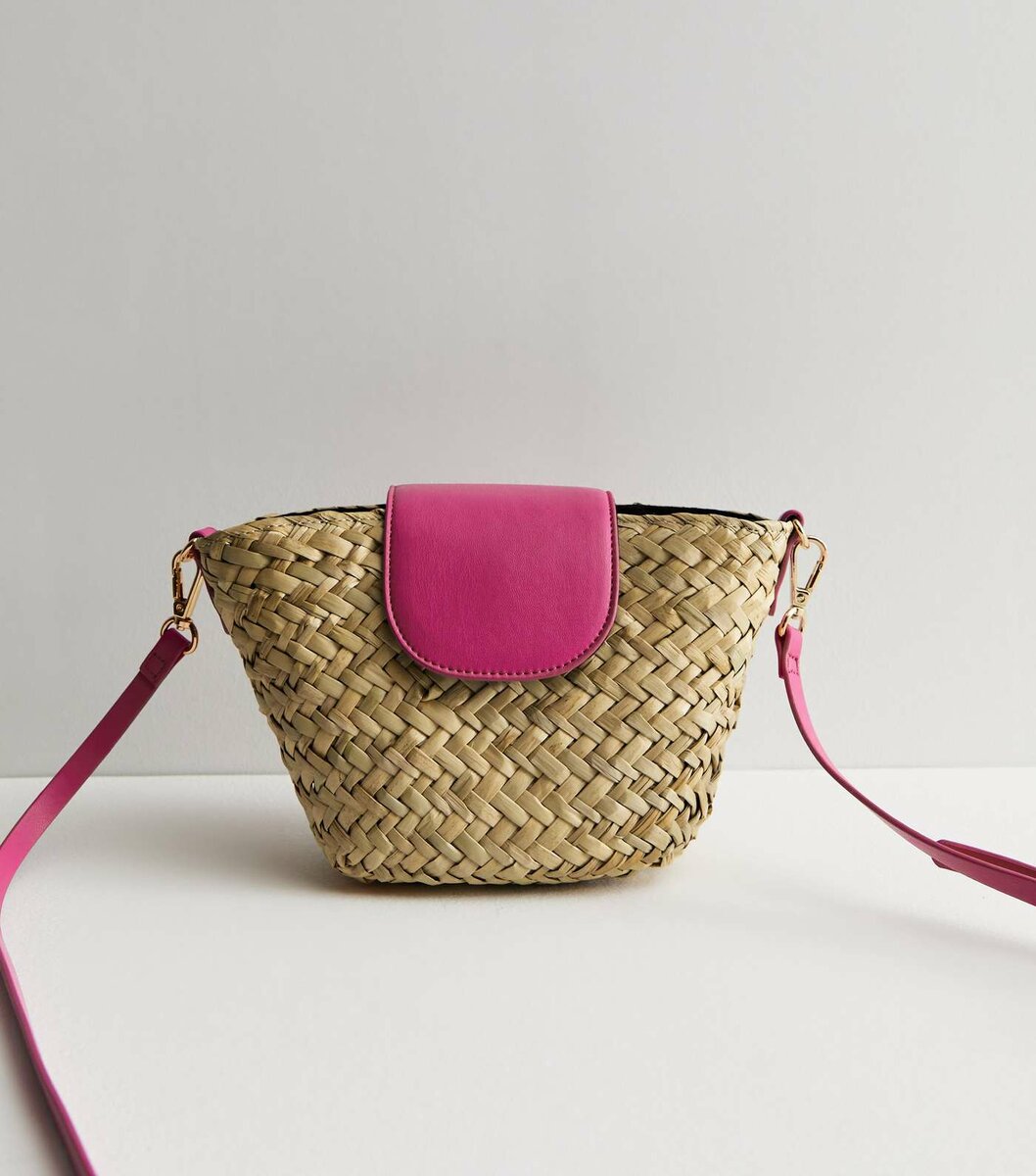 Straw effect, pink leather flap, ping cross body strap