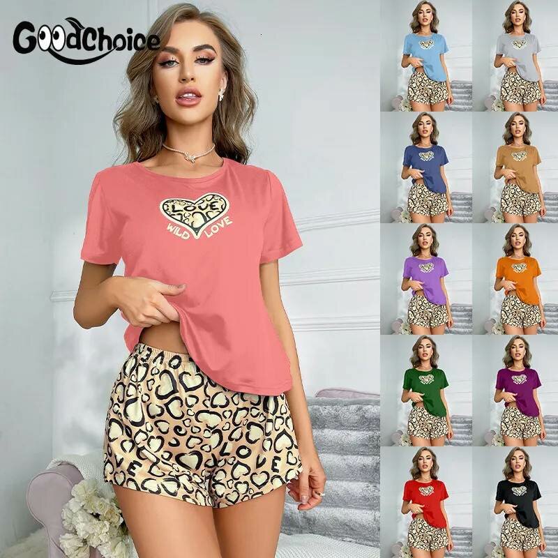 Cross border sleepwear, women's love leopard print home fast fashion set, cute T-shirt shorts, casual women's home clothes