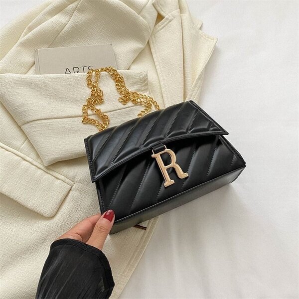 Sac noir matelassé avec chaîne dorée et initiale R